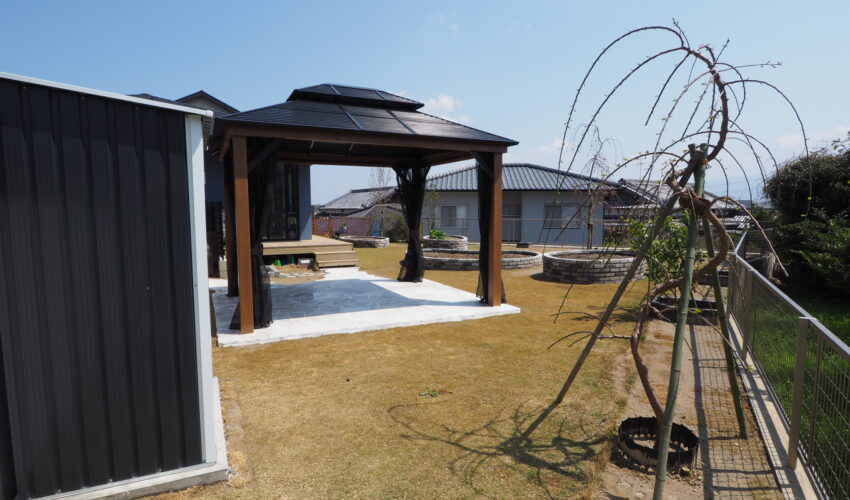 お庭の主役は、重厚感のあるガゼボ(あずまや)。白い石畳(テラス)が描く直線的なラインは、お庭に洗練されたモダンな印象を与えます。テラスに続くステップや目隠しフェンスが、プライバシーを保ちつつ、居心地の良い「セカンドリビング」を創り出します。